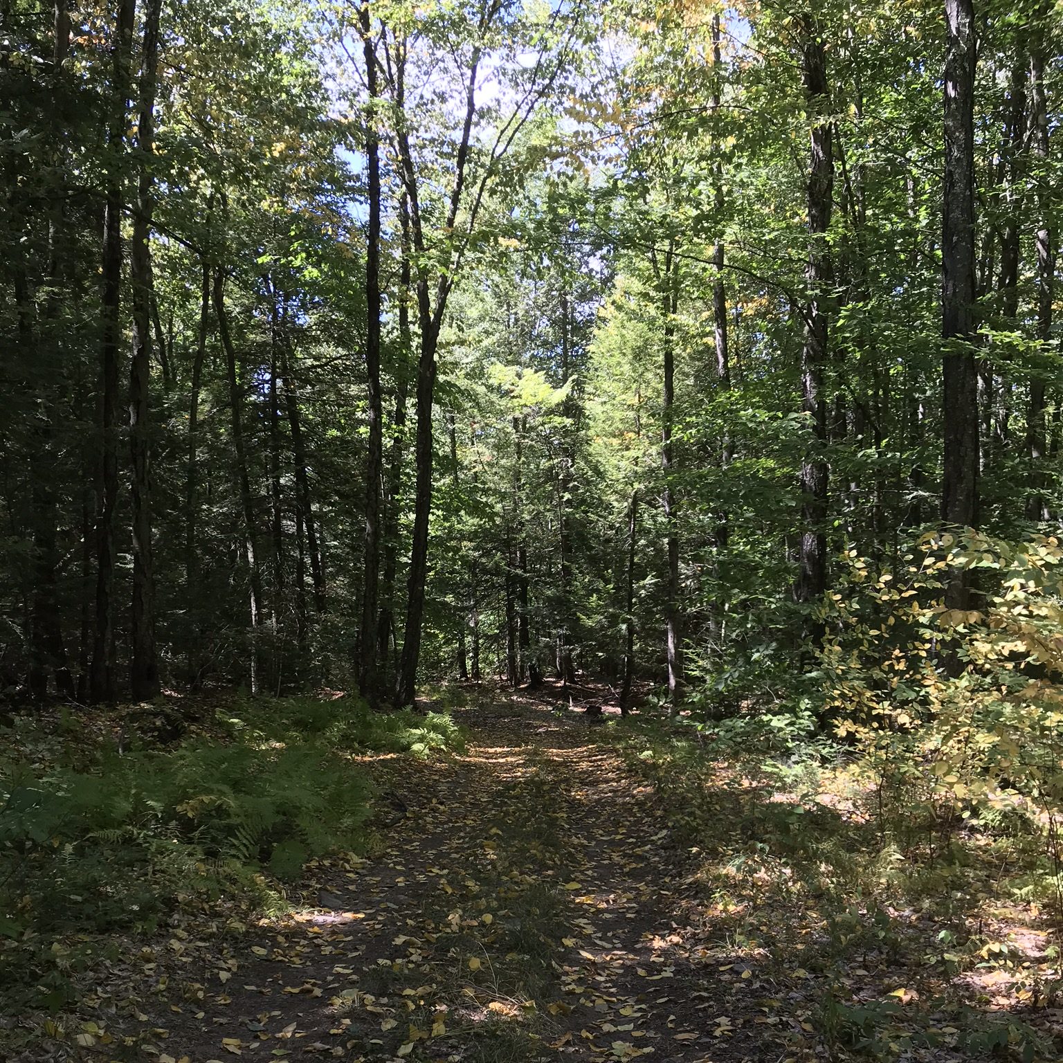 A leaf-layered woodland pathway through dense hardwood trees on a