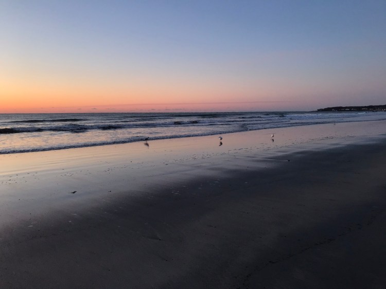 The untouched, cool, wet packed sands of a new morning beach as the tide continues to slip out to sea.