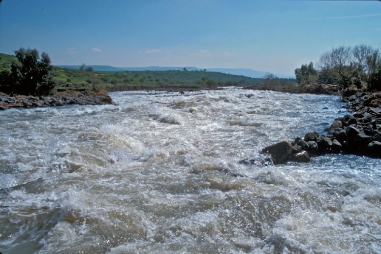 The unstable waters of the swiftly moving, wide-reaching Jordan River at springtime.